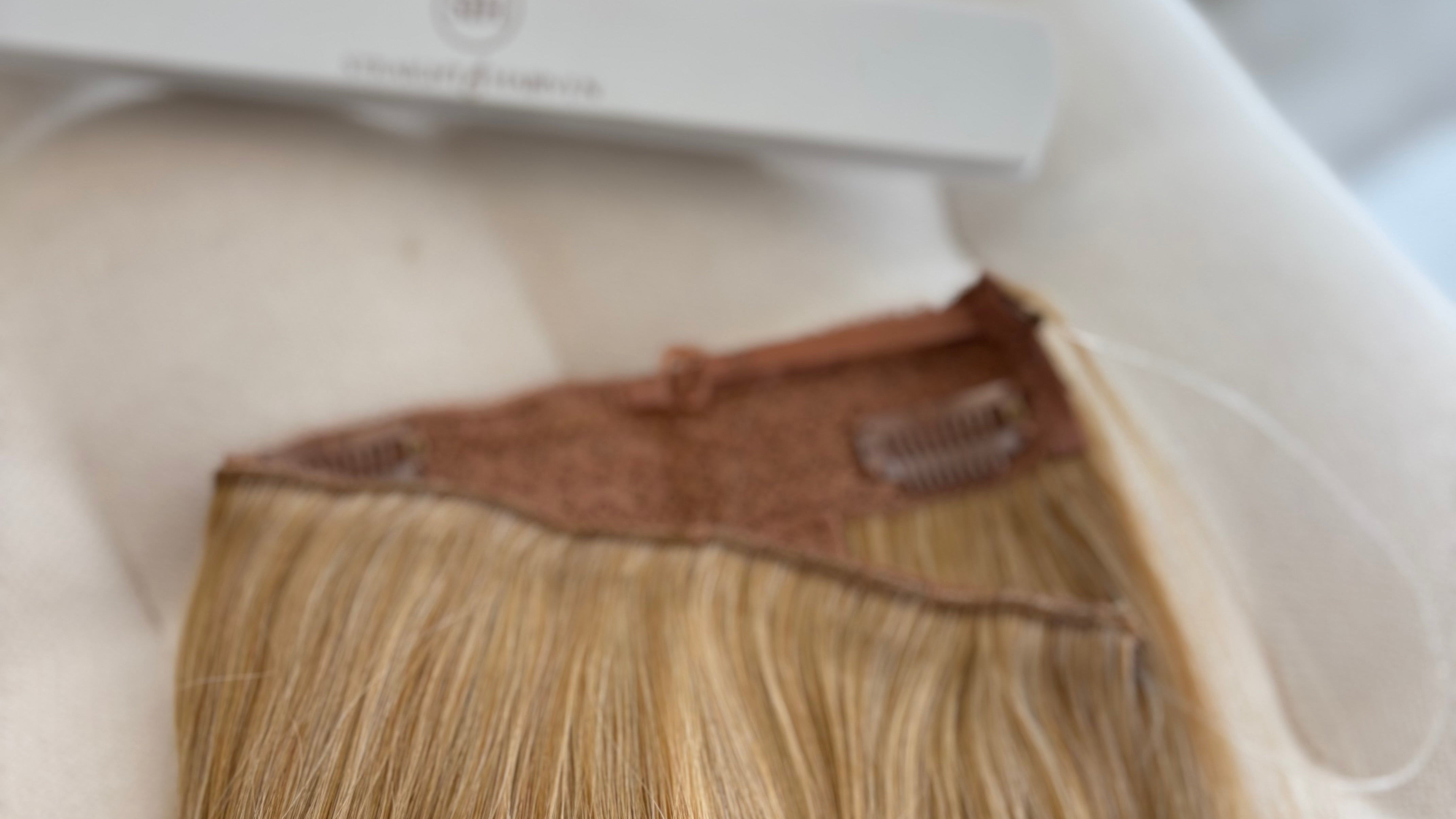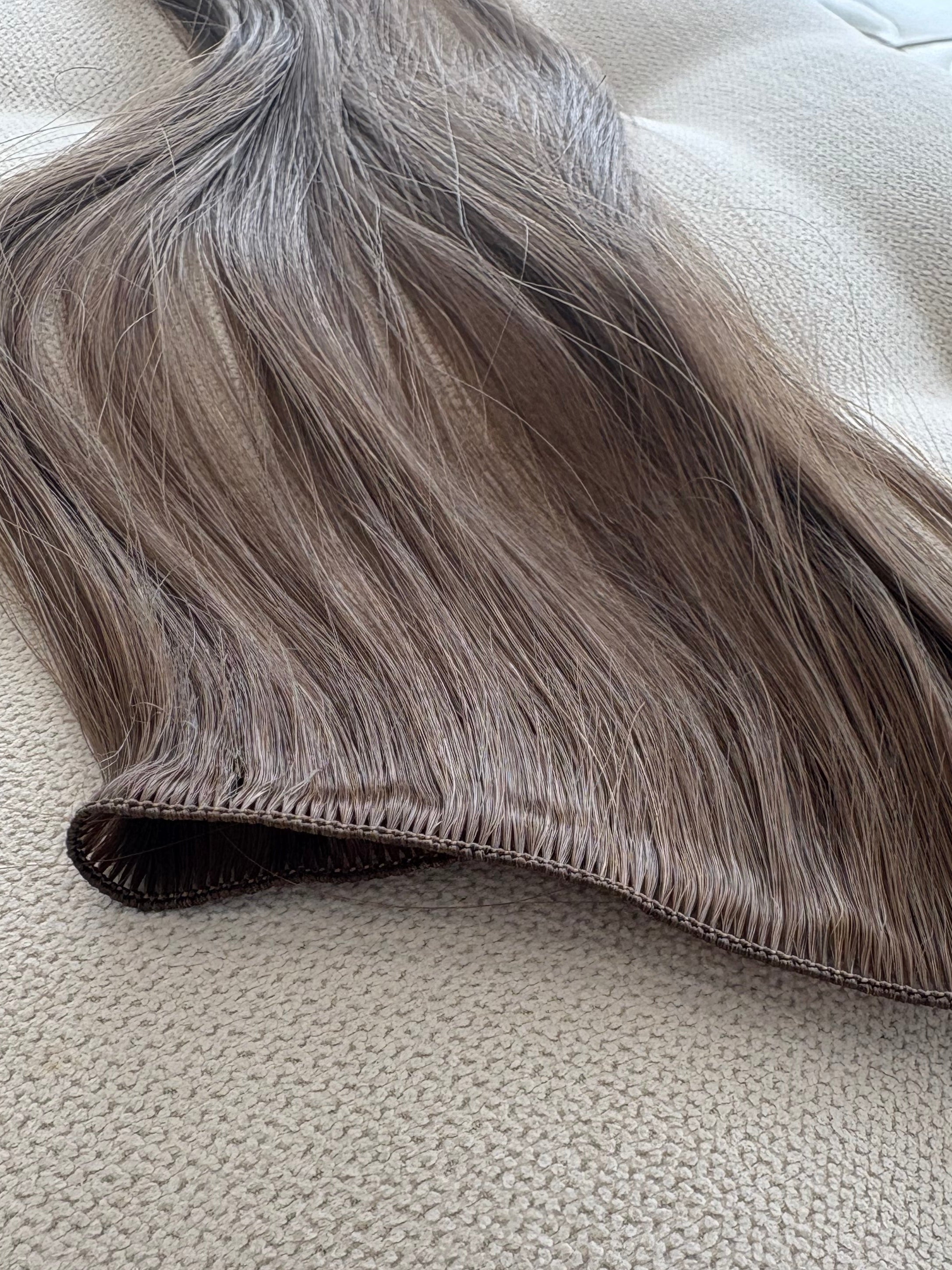 Hand Tied wefts are exactly that, Hand Tied. They are woven together by hand onto fine string creating the thinnest weft possible. They are very strong and a lot flatter than machine sewn wefts but can still give you thick luscious hair.