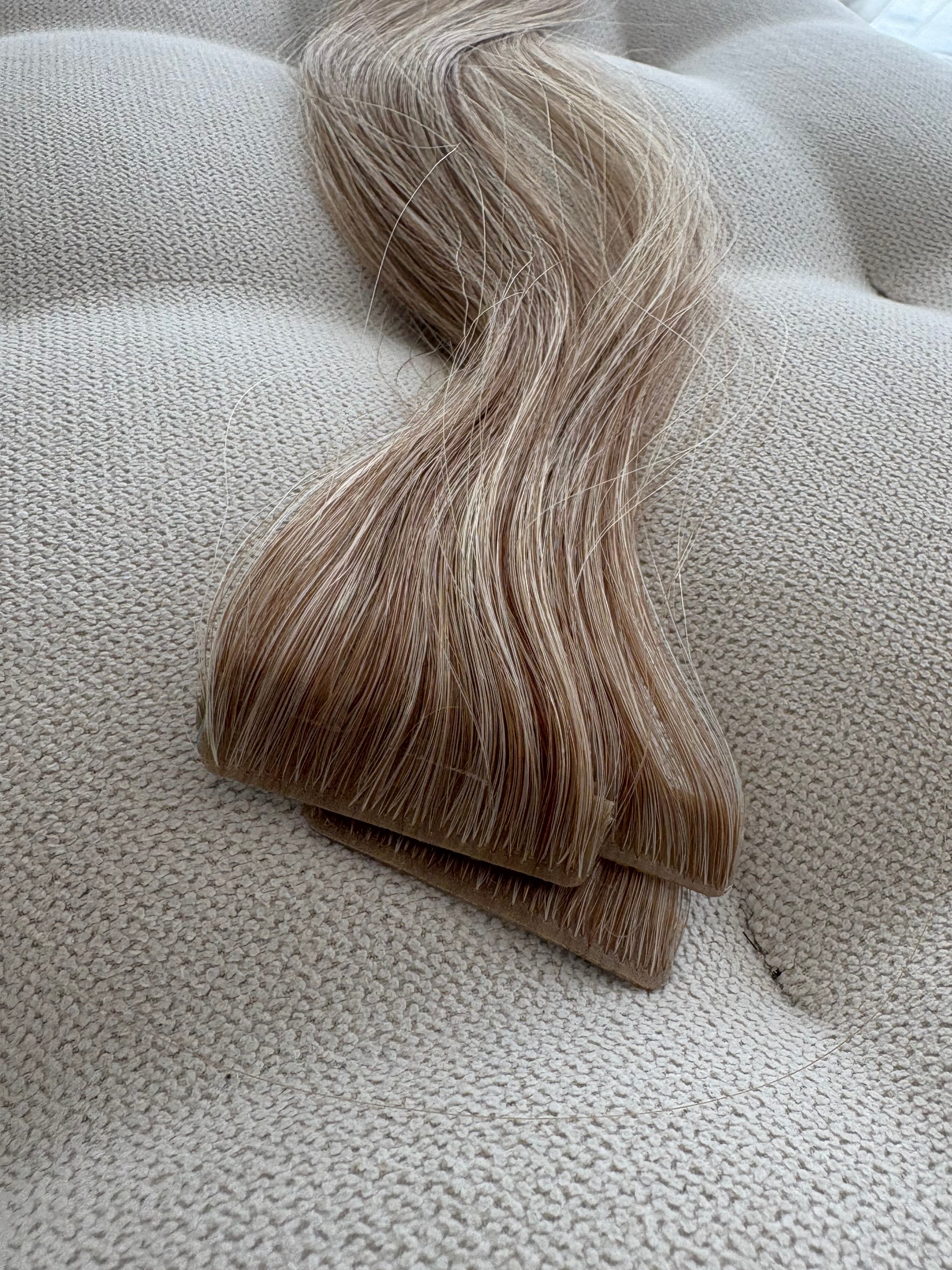 They are light weight, comfortable and sit extremely flat on the head. They are 4cm wide and are applied to dry, clean hair by sandwiching a small amount of the natural hair between two pieces of tape extensions. They stay in the hair until they are gently removed with solution during maintenance.