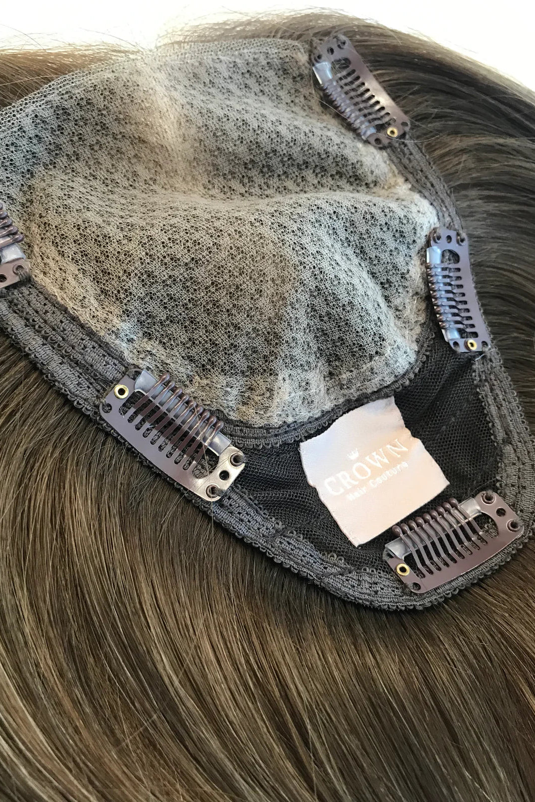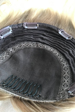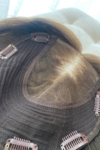 This is a Closed Lace Hair Topper, if you are worried about blending this is your dream piece! Nothing will sit flatter or feel more lightweight than a closed lace topper piece. They come standard as an 8" x 8" cap and can be custom ordered in any hair length or density.