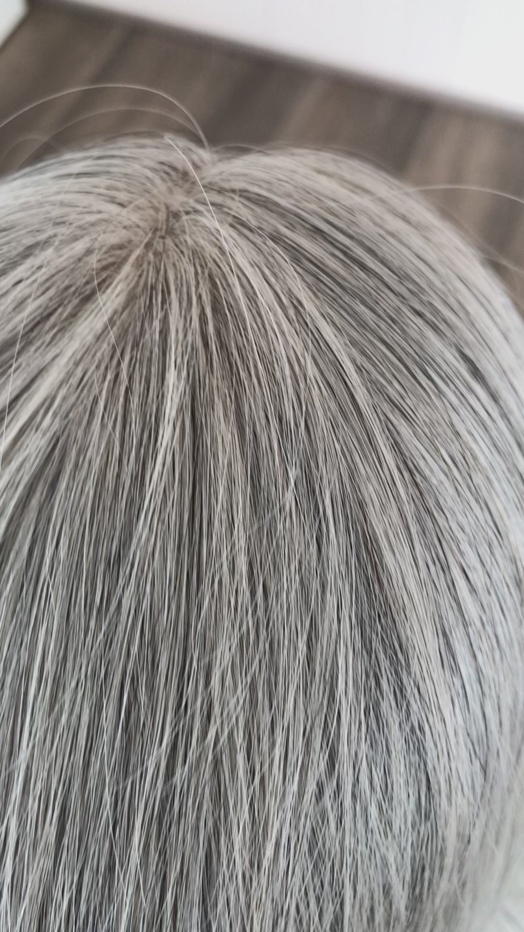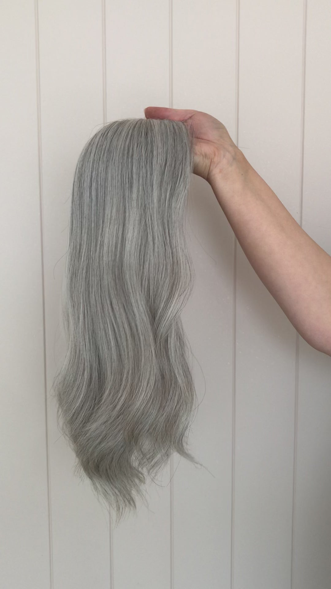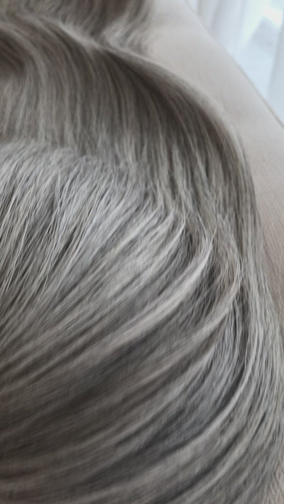 A beautiful natural salt and pepper grey. In hairdresser terms she would be approximately 50 - 75% grey. We do have other grey options available for pre order please reach out if this isn't the perfect grey for you.